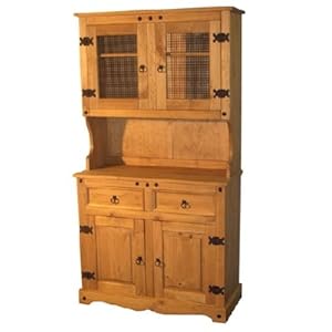 A really useful and attractive Mexican pine double door dresser. The three lower doors have solid pine centre panels and the upper doors have mesh inserts in a solid pine frame. The result? It looks fantastic. There is no chipboard, MDF or hardboard. It is all made from solid pine apart from parts of the back are plywood. This is real wooden furniture at a fraction of the cost you thought it would be. If you want your kitchen to have that traditional 'unfitted' look, then look no further than our Mexican range. The drawer runners are of solid wood. The handles and hinges are constructed to a higher than normal standard to ensure our quality throughout. It will grace your home for many years to come. Height is 184 cm Width is 99 cm Depth is 45 cm The picture shown is representative of the actual item, as it is a natural product there may be variations in the shade or the cut of wood. The product comes flat packed and has full clear instructions to ensure easy home assembly. Please note that, where applicable, all sides, tops and fronts are solid panels. The drawer runners are made from solid wood, not plastic. The backs and drawer bottoms are constructed from plywood not hardboard, cardboard or chipboard. When you buy this, you can buy with confidence because all of our furniture is built to exacting standards to ensure that, not only will it look beautiful and be fit for purpose, but it will stand the test of time and will grace your home for many, many years